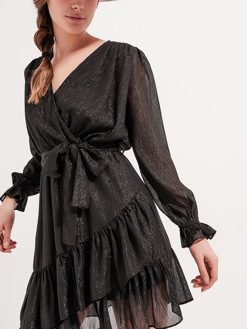 Length: Mini length. Subcategory: Dress. Collar: V-neck neckline. Sleeves: Long Sleeves. Style: Party. Fabric: Chiffon. Seam: Elasticated frill cuffs. Product details: Pleat detail. Waist: Tie waist. runs true to size. S.