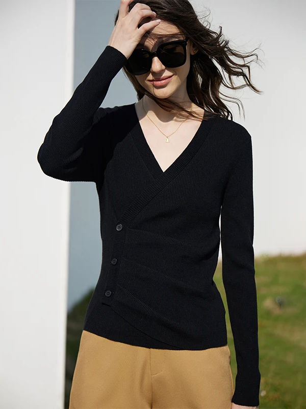 V-Neck Shirring Knit Sweater Spring Office Casual Chic