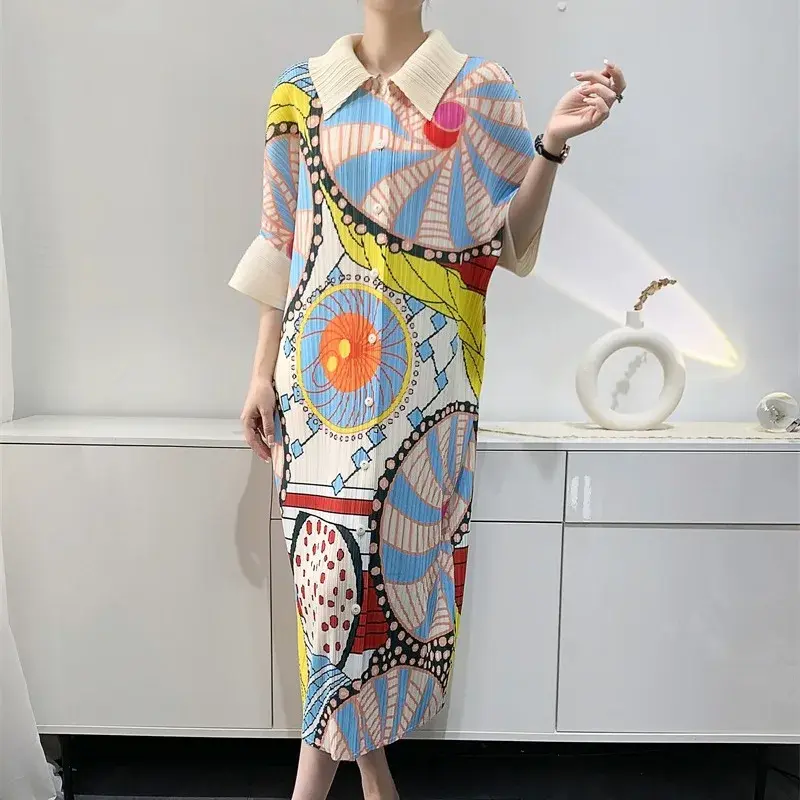 Tags: issey miyake style pleated dress, loose fit printed midi dress, batwing sleeve pullover dress, plus size pleated midi dress, women's turn down collar dress, mid-calf casual printed dress, high stretch comfortable dress, all season pleated dress for women, japanese style pleated dress, relaxed fit batwing sleeve dress, A-line printed midi dress, easy wear pullover dress women, artistic print pleated dress, comfortable travel midi dress
