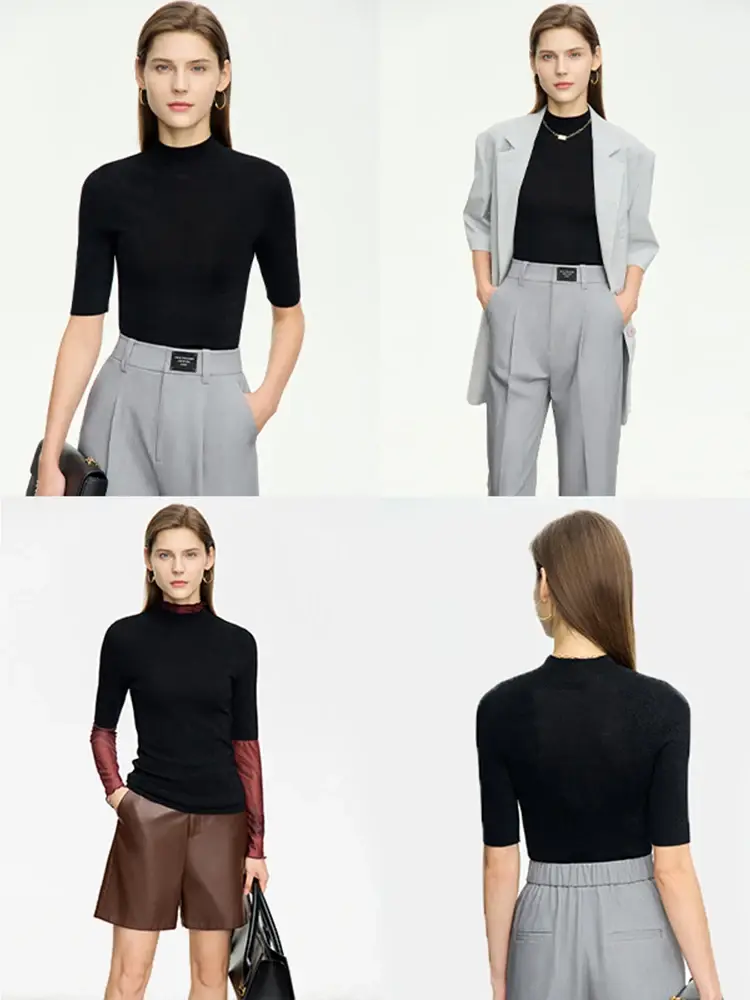 Elevate your autumn/winter wardrobe with this sleek and stylish sweater. Crafted from a blend of luxurious wool, nylon, and polyester, this mock neck sweater offers a comfortable fit and a touch of sophistication. The slim fit and half sleeves create a flattering silhouette, making it ideal for both casual and office wear. This sweater is made from a blend of wool, nylon, and polyester, providing both warmth and a soft feel against your skin. This versatile sweater is perfect for a range of occasions, from casual outings and office meetings to evening events.