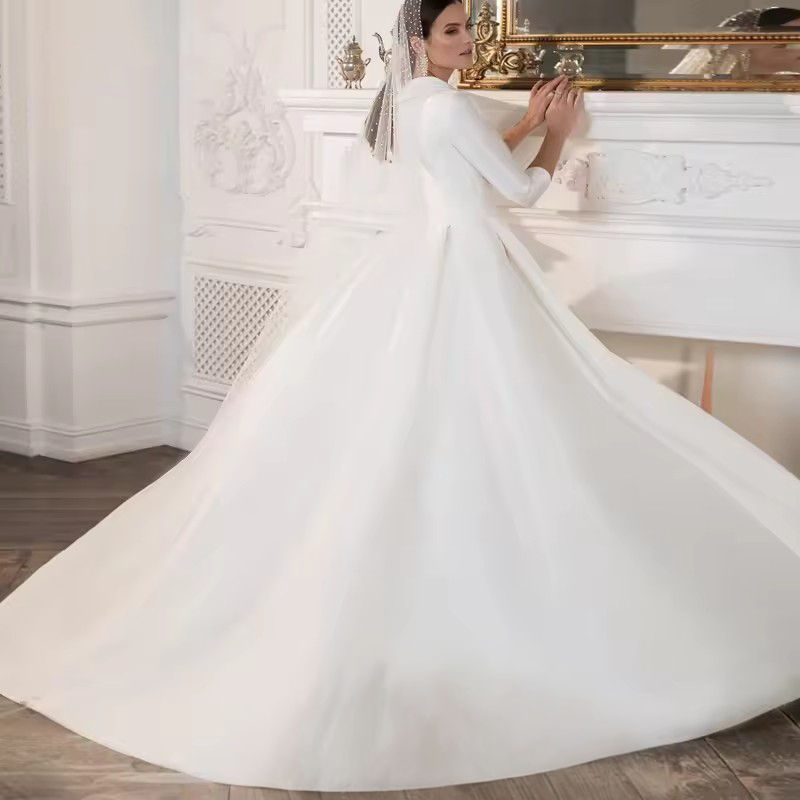 Tags: Muslim wedding dress satin, simple V-neck wedding gown, three quarter sleeve bridal dress, A-line wedding dress for pregnant bride, empire waist wedding dress, soft satin wedding dress floor length, modest muslim wedding dress, elegant bridal gown with sleeves, affordable satin wedding dress, plus size muslim wedding dress, custom size wedding dress online, court train wedding dress, minimalist wedding dress satin, comfortable wedding dress for pregnancy.
