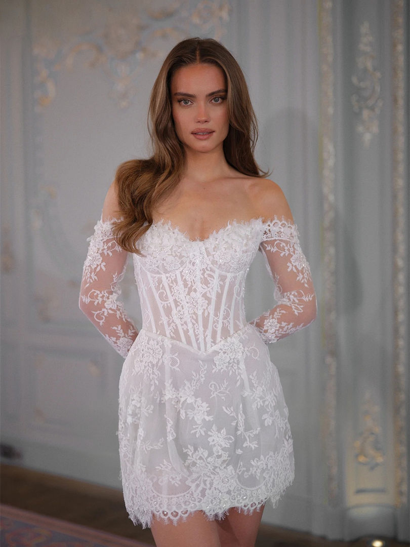 Lace Appliques Off Shoulder Long Sleeve Backless Mini Wedding Dress White Ivory