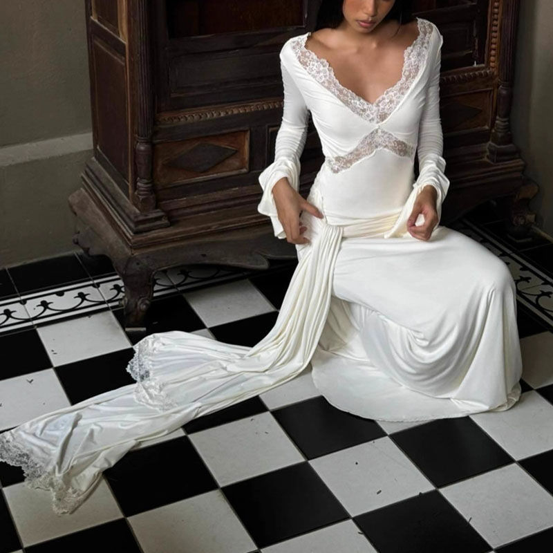 Tags:long sleeve v-neck evening dress, flare sleeve A-line maxi dress, women's autumn party dress, solid color lace detail dress, empire waist ankle-length dress, elegant slim fit pullover dress, sexy v-neck dress for dinner date, long sleeve holiday event dress, women's flare sleeve party dress, A-line dress with lace sleeves, ankle length dress for fall occasion, slim fit evening gown with sleeves, v-neck empire waist maxi dress, elegant pullover dress for women