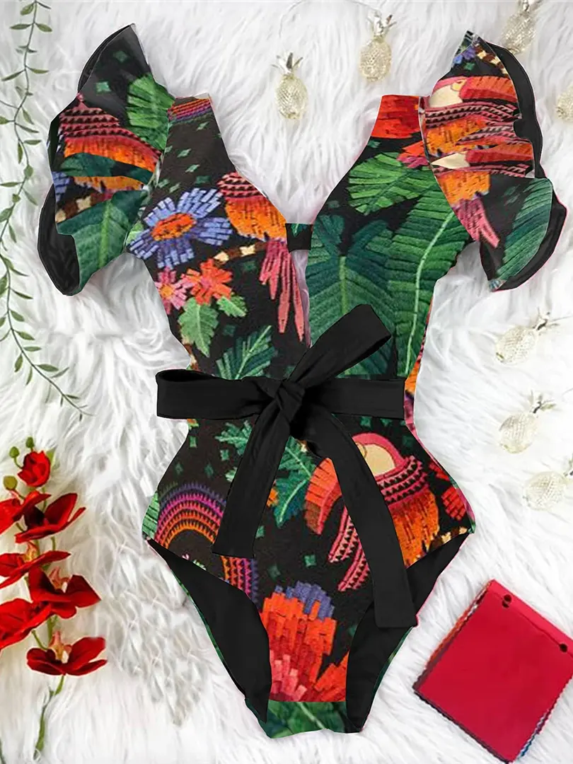 This chic one-piece swimsuit features a vibrant floral pattern, perfect for making a splash at the beach or lounging poolside. Its classic design and comfortable fit make it a stylish and versatile choice for all your swimwear needs.
