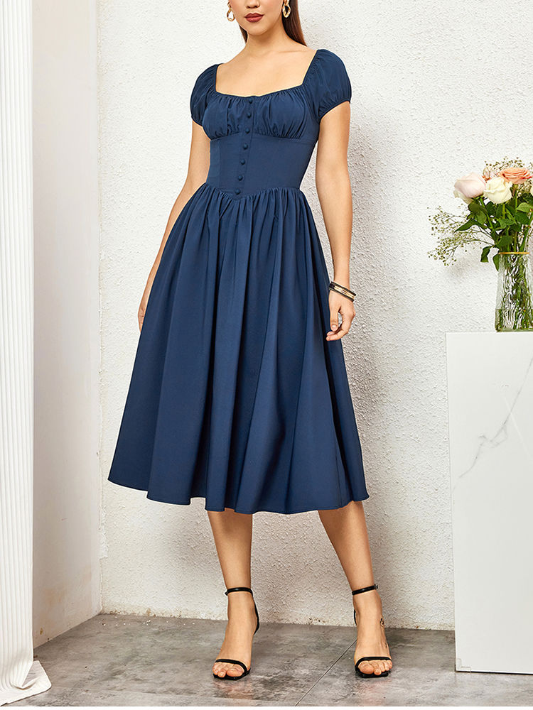 Tags: navy blue corset bodice midi dress, square neck a-line dress with short sleeves, flowy navy midi dress for summer, short sleeve corset style dress, women's navy blue swing dress mid-calf, stretchy a-line midi dress with zipper, casual navy party dress with sleeves, square neckline dress for wedding guest, vintage inspired navy blue midi dress, corset top with a-line skirt dress, comfortable navy blue summer dress, A-line dress with structured bodice, navy blue dress with button front detail, slim fit square neck midi dress