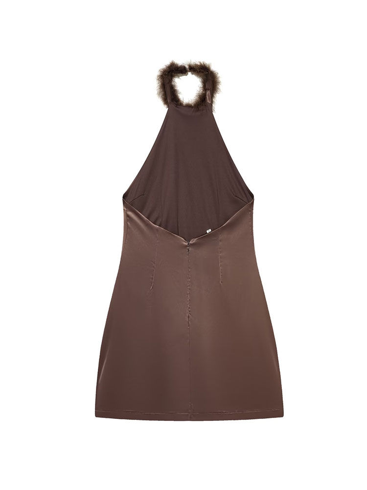 Tags:satin halter neck mini dress, backless party dress for women, sexy cocktail dress with fur trim, women's A-line satin mini dress, halter top dress for night out, short backless dress for birthday, sleeveless satin dress with open back, solid color going out dress, sexy date night outfit dress, A-line mini dress with fur detail, non-stretch satin halter dress, above knee backless cocktail dress, women's sleeveless party dress, fashion solid backless sleeveless dress
