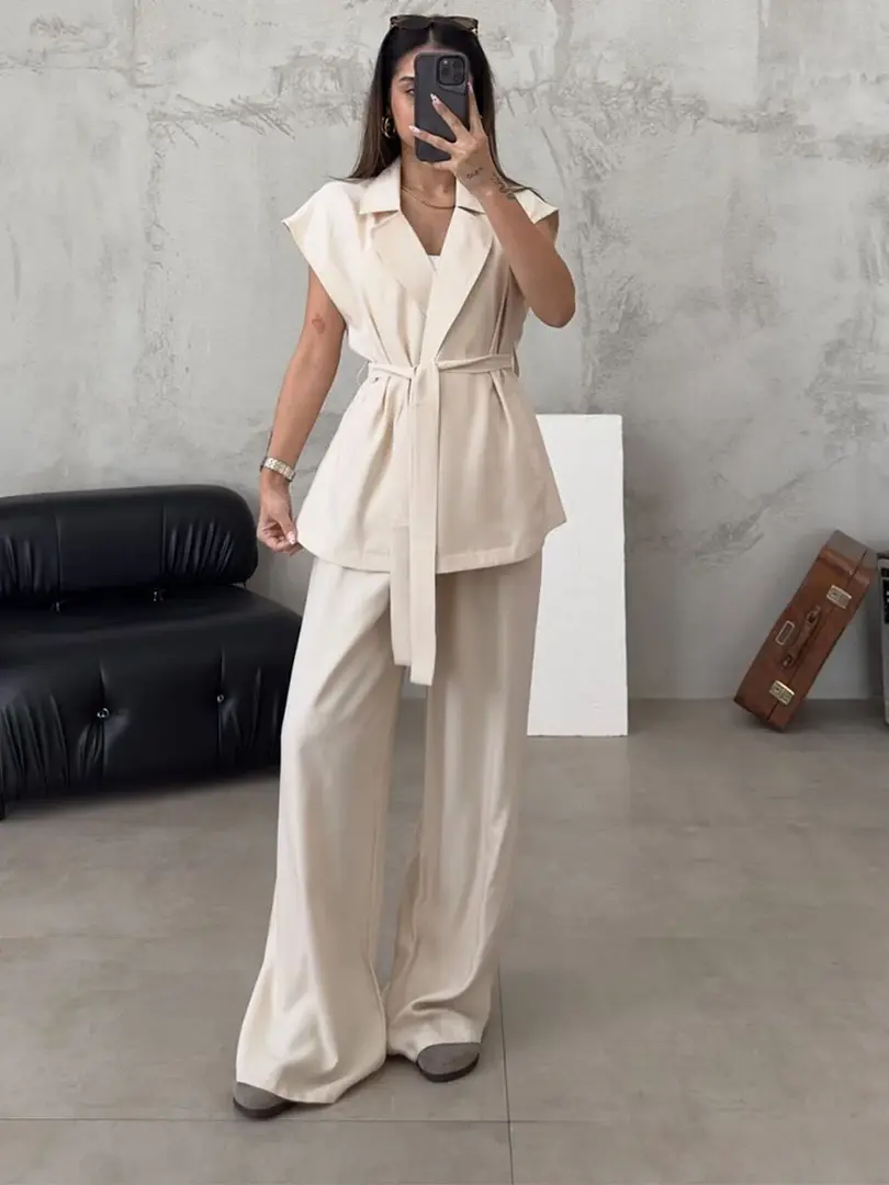 Notched Lapel Sleeveless Top & Drawstring Wide Leg Pants Two Piece Set