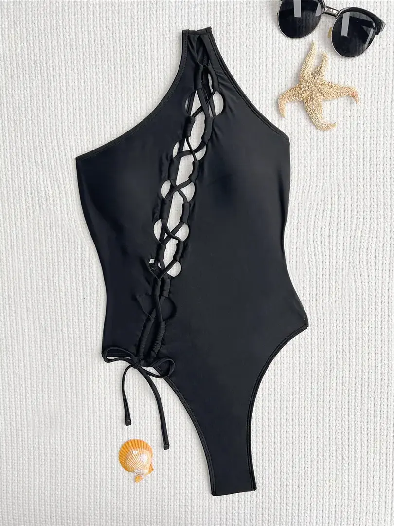 One Shoulder Lace Up Asymmetric Swimsuit - High Cut Monokini