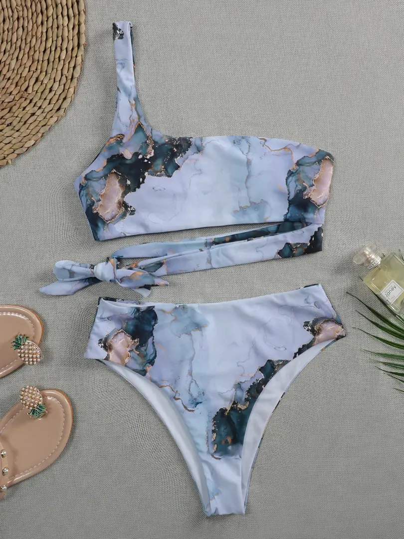 One Shoulder Marble Print Bikini High Waist Swimsuit