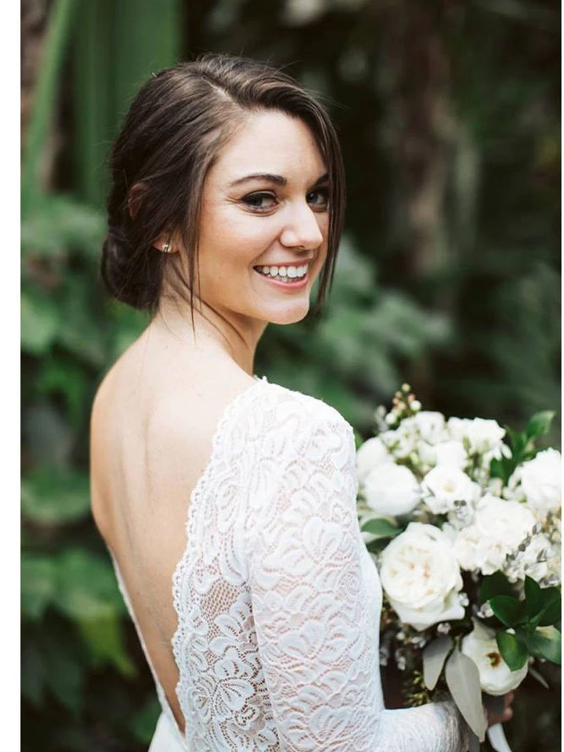 Ivory Wedding Dress Long Lace Sleeves, Boat Neckline, Deep V-Neckline, Floor Len