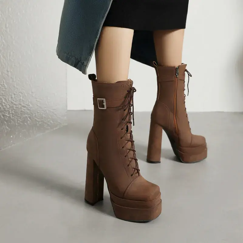 These bold martin boots are designed to make a statement, featuring a lace-up front and a chunky platform sole. The mid-calf height adds a touch of edge to any outfit, while the square toe provides a comfortable and stylish fit.