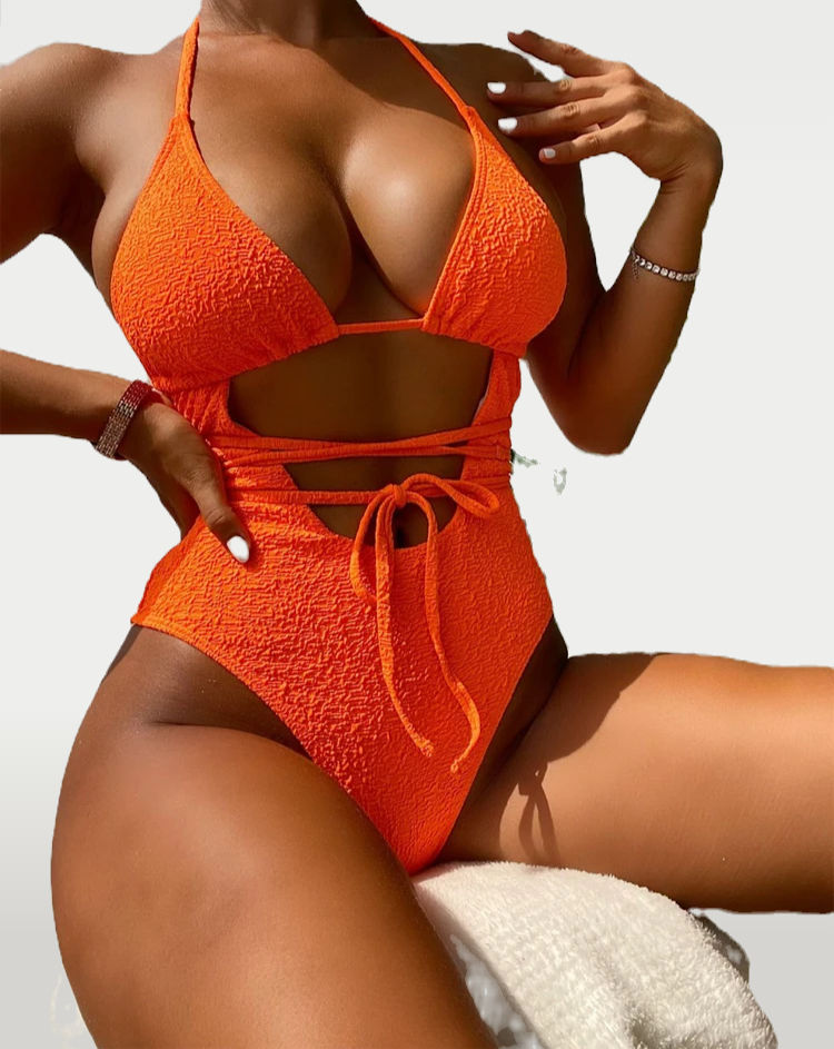 Orange One Piece Swimsuit Halter Neck Bandage Monokini Swimwear