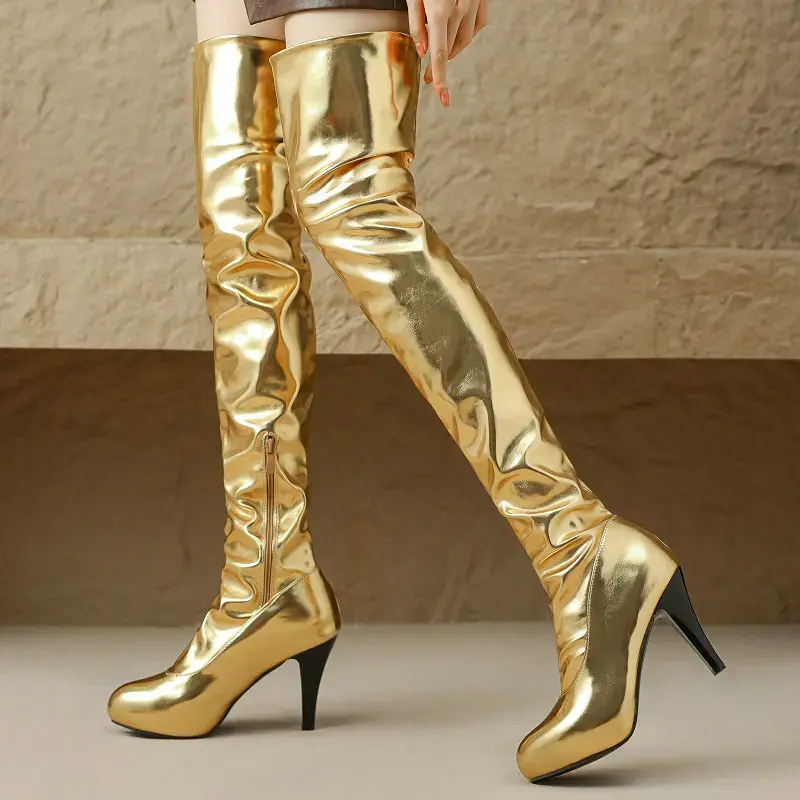 Overknee Spiky Stiletto Heels - Patent Leather Silver Gold Pleated