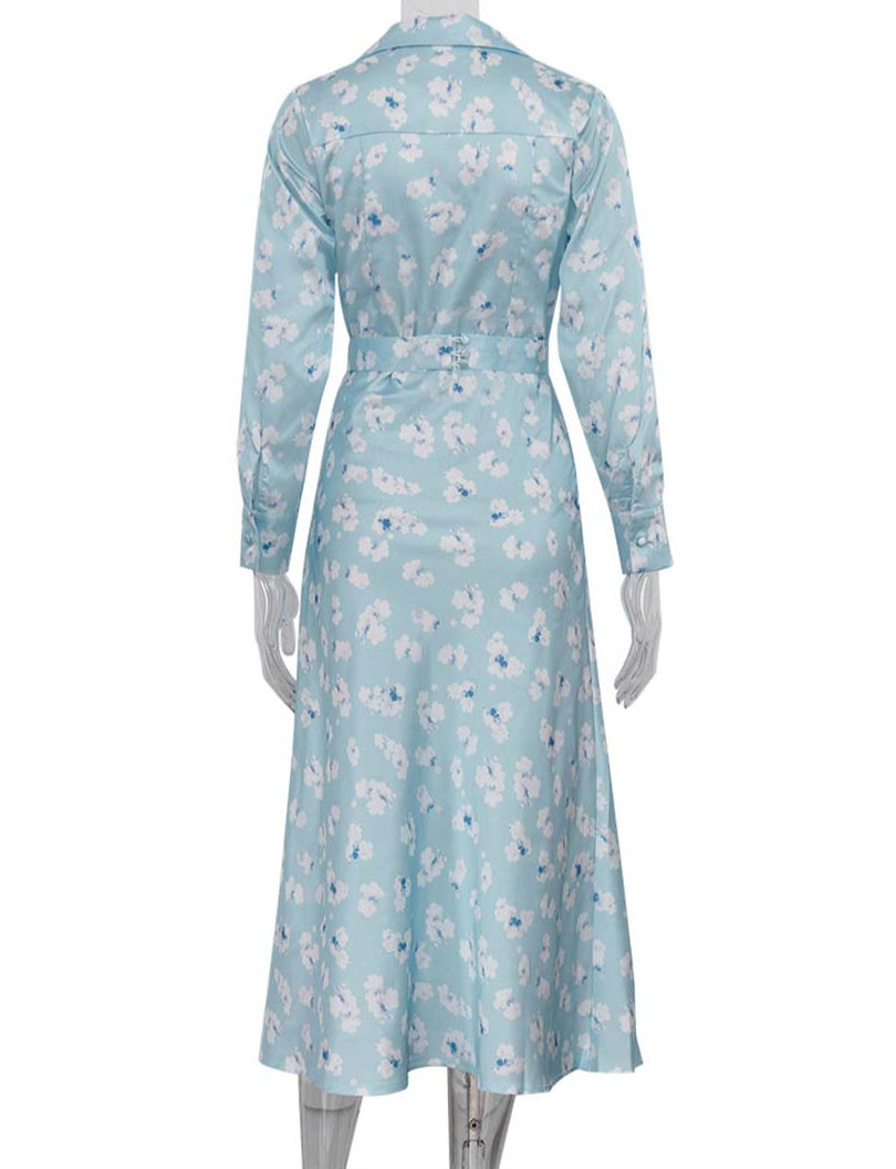 Printed Straight Dress, High Waisted Mid-Calf Pullover, Blue Turn-Down Collar