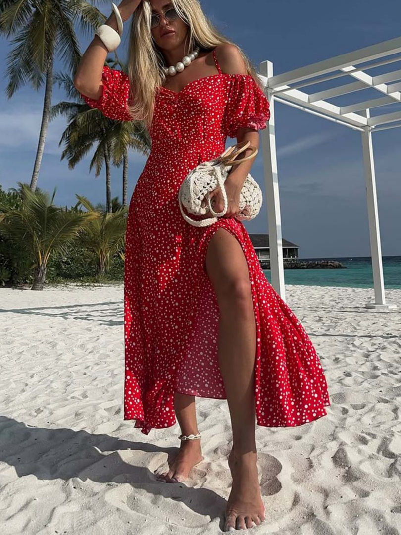 Red Printed Mid-Calf Dress, Spaghetti Strap Pullover, Slash Neck Loose Fit