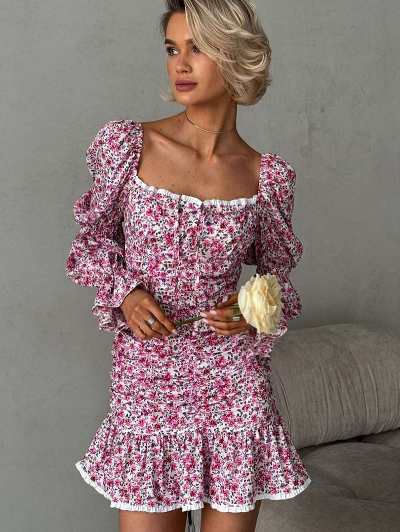 Pleated Mini Dress, Long Sleeve Patchwork Pullover, Purple Print, Square Collar