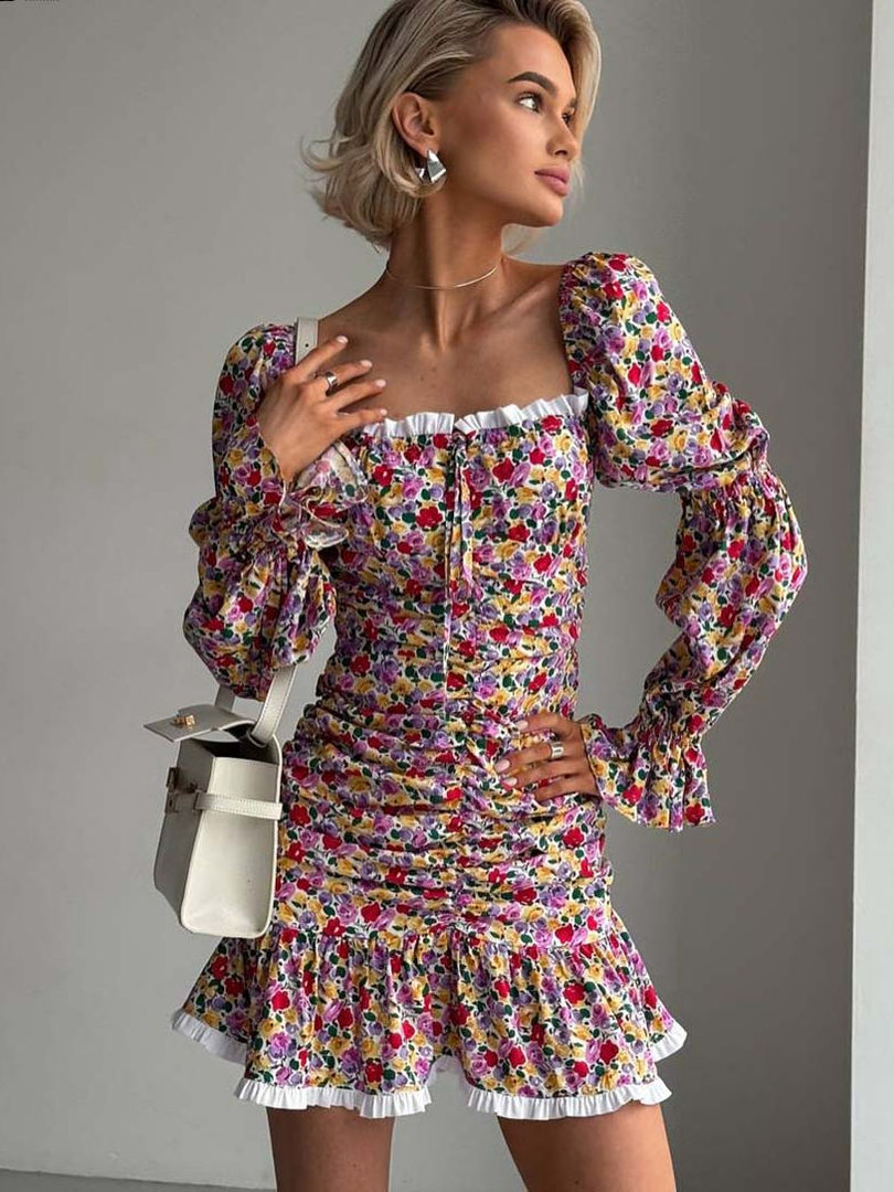 Tags: purple patchwork print mini dress, long sleeve square neck casual dress, lace up pleated dress for autumn, women's purple print above knee dress, dropped waist long sleeve dress, casual purple dress with lace up detail, spring autumn patchwork dress for women, square neckline pleated mini dress, long sleeve purple print dress for women, slim fit non-stretch mini dress, what to wear for a casual weekend, easy to style pullover dress, women's woven patchwork dress