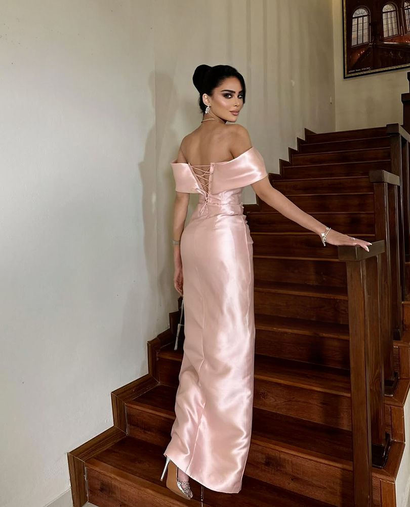 Pink Evening Dress Off Shoulder Sweetheart Column Prom Gown Pleated Satin Formal