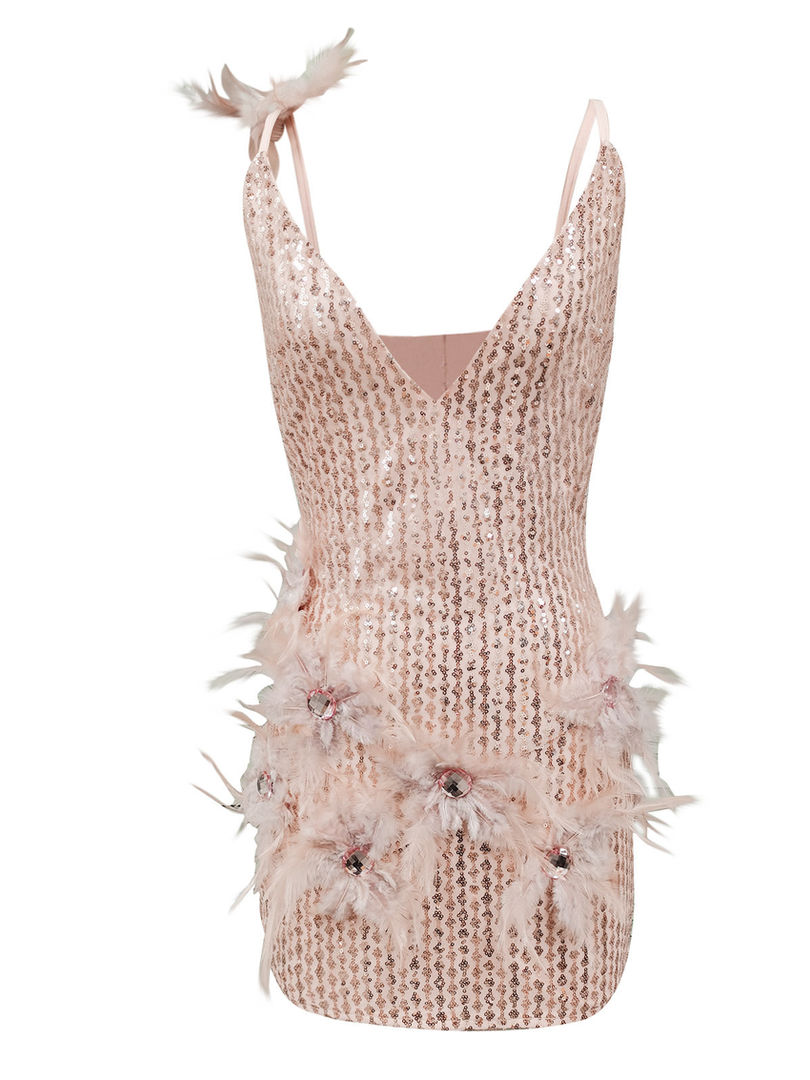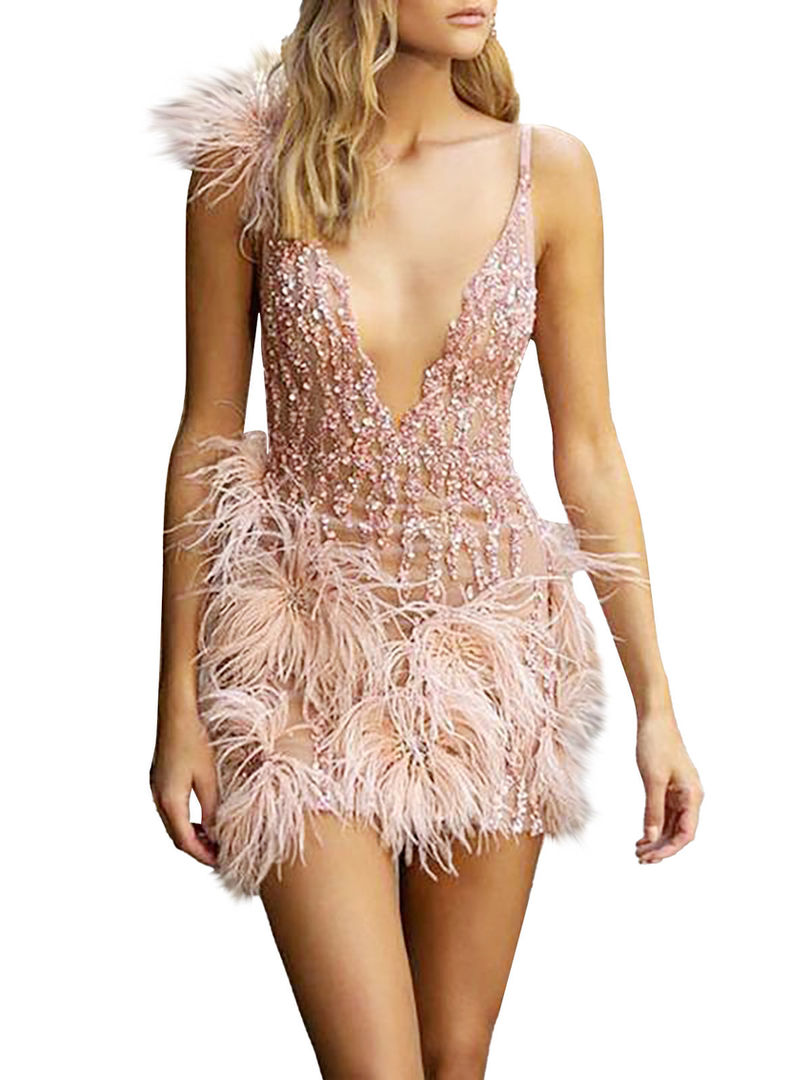 Pink V-Neck Feather Mini Dress Fashionable Bodycon Quality Mini High Luxury Wome