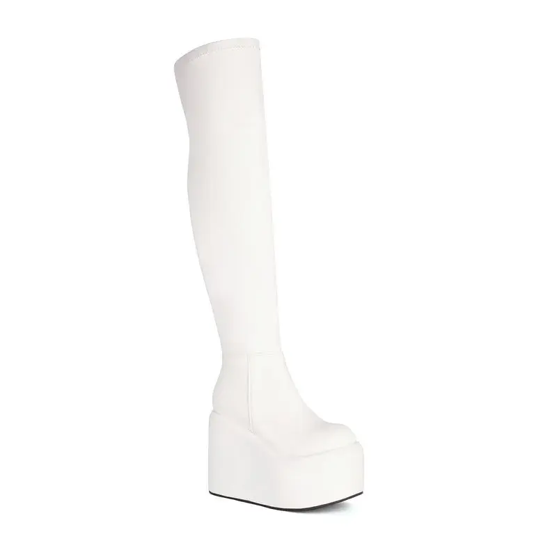 These over-the-knee boots are designed to make a statement, featuring a trendy platform sole and sleek silhouette that elongates your legs. The stretch material ensures a comfortable and flattering fit.
