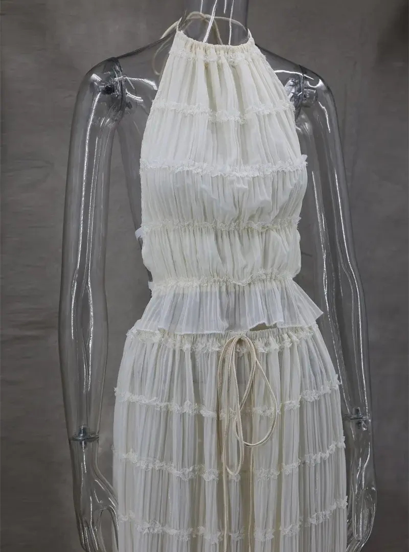 Pleated Beach Dress Set, Halter Top & Long Lace Dress, Swimwear Cover Up