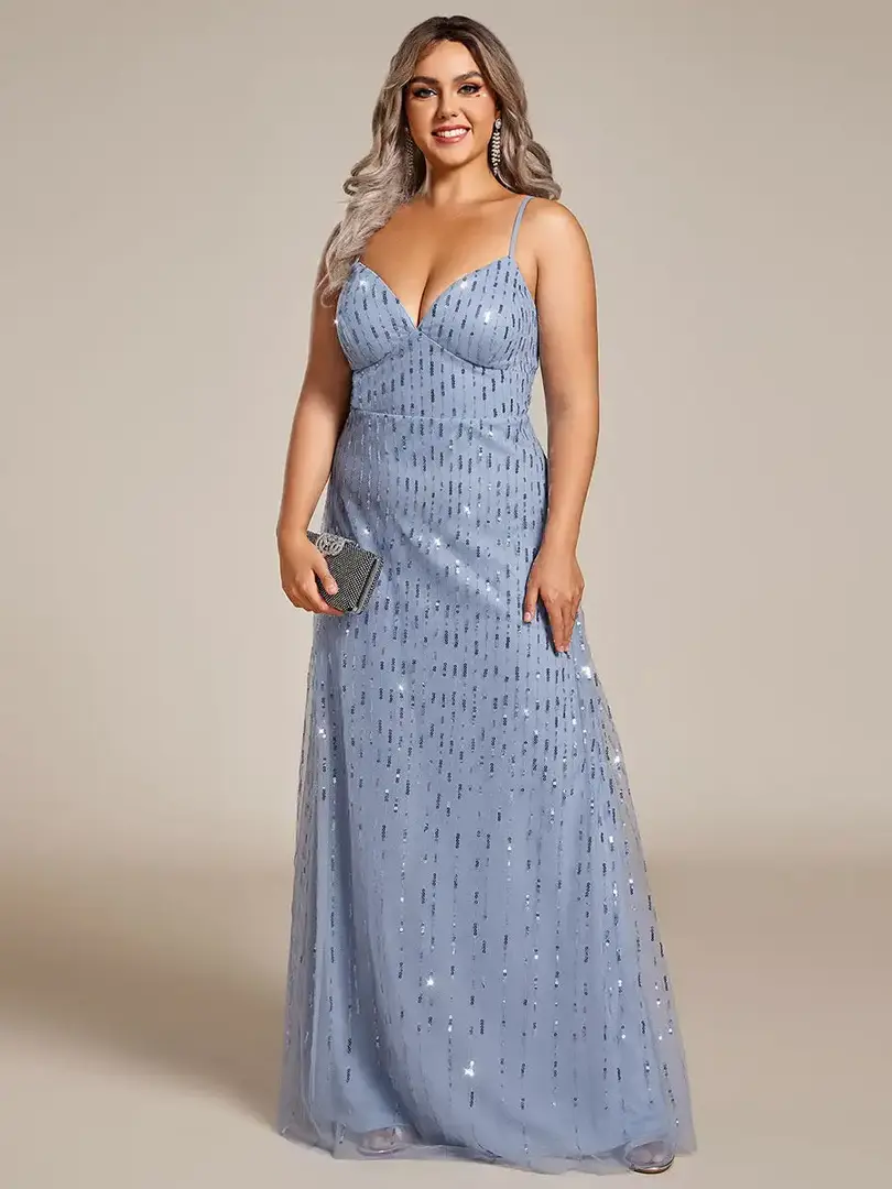 Plus Size Evening Dresses Maxi Long Tulle Sequin v Neck Spaghetti Straps 2024 Ev