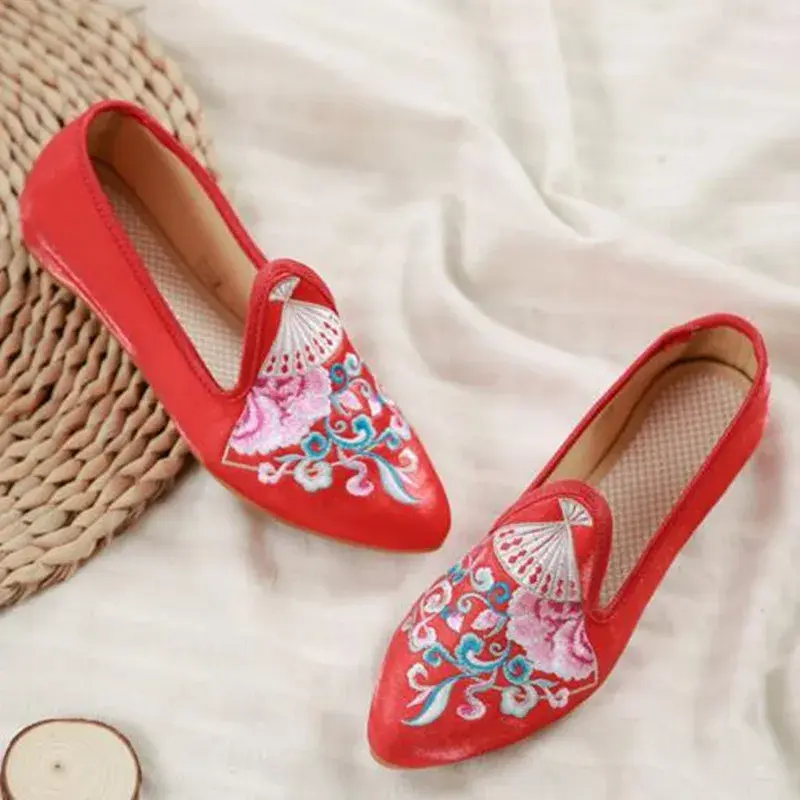 Pointed Toe Loafers Wedges Pumps Embroidered Low Heel Shoes