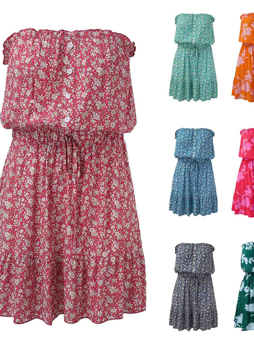 Strapless Floral Print Knee-Length Sleeveless A-Line Bohemian Pullover Dress