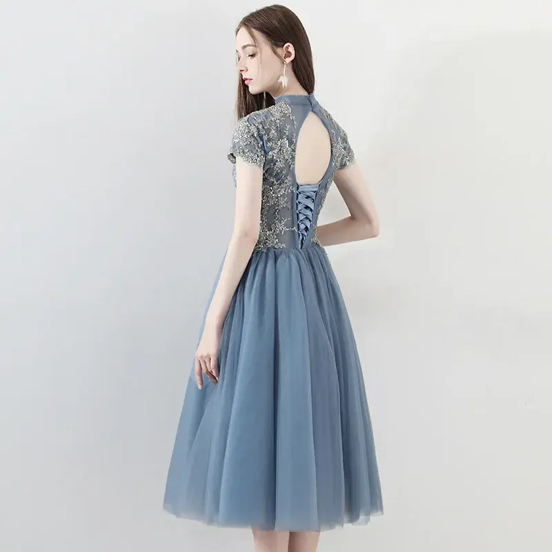 Tags:formal knee length evening dress, high neck cocktail dress, A line prom dress, short sleeve evening gown, organza party dress, polyester evening dress, appliques formal dress, built in bra evening dress, classic style evening dress, wedding guest knee length dress, formal event cocktail dress, simple elegant evening dress, knee length formal gown, short formal dresses for women.