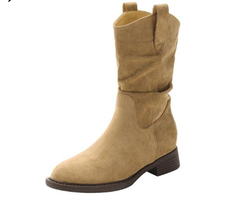 Tags: women's slip on mid-calf boots, high heel round toe booties for women, solid color flock boots women, pleated mid-calf fashion boots, comfortable height increasing boots, women's stylish autumn boots, mid-calf boots to wear with skinny jeans, easy pull on heeled booties, modern round toe boots for women, women's solid color slip on booties, soft flock upper mid-calf boots, casual dress boots for women high heel, pull on mid-calf boots no zipper, women's spring fashion boots with heel