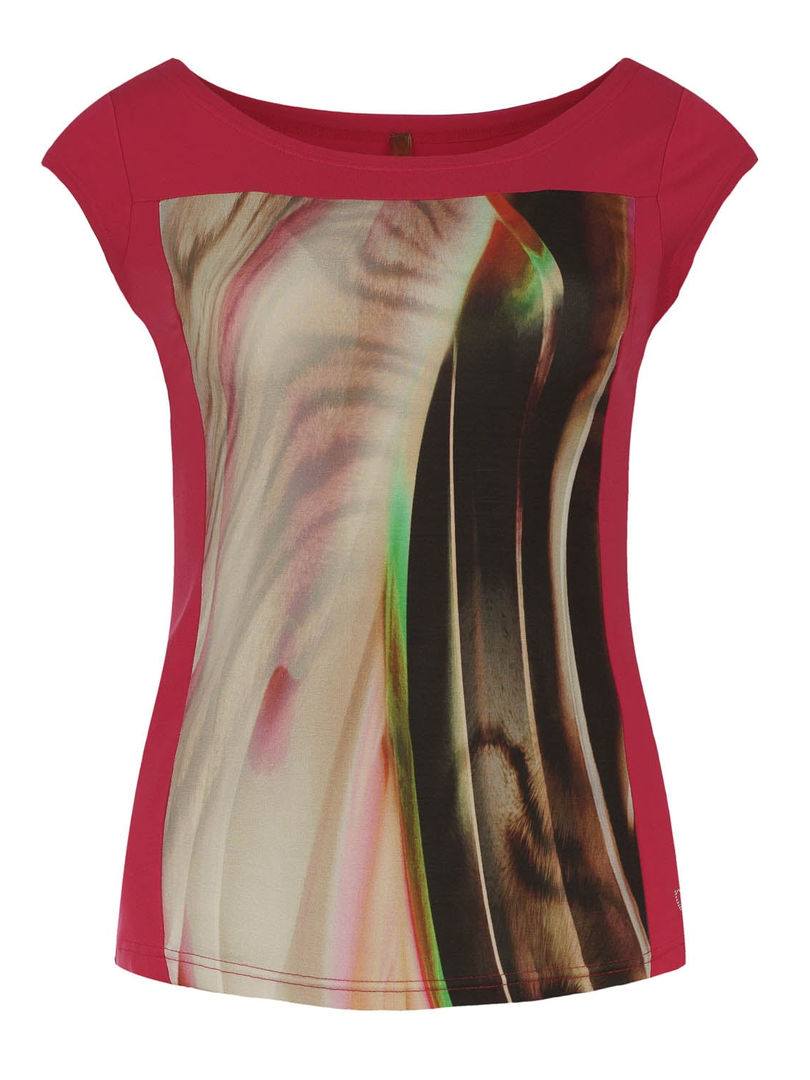 Summer top in stretch jersey fabric. Round neckline and cap sleeves. Seam detail in the front and back. Print in the middle in the front and back. Solid red colour on the sleeves, neckline and sides. Fitted. Our model is 172cm and is wearing size 38. 92%VISCOSE-8%ELASTANE