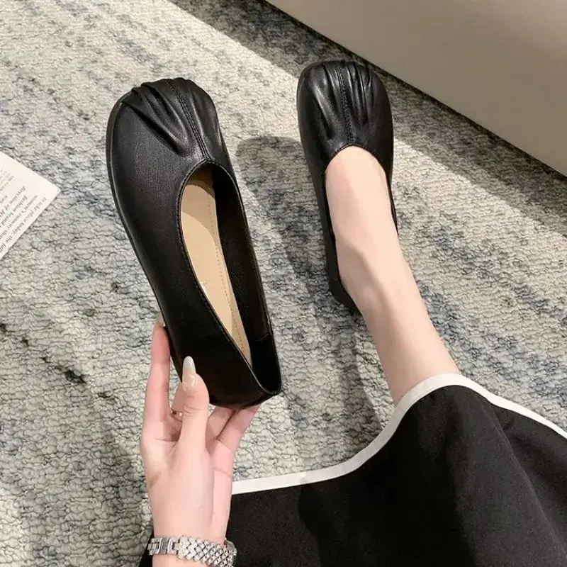 A study in unadorned chic, these flats offer a grounded elegance. Their smooth silhouette and round toe whisper rather than shout, suggesting a quiet confidence.