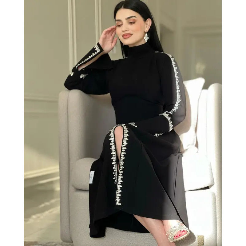 Tags:black high neck prom dress, long sleeve prom dress, A-line prom dress ankle length, formal evening dress with slit, Saudi Arabia prom dresses, classic prom dress for women, elegant prom dress with built-in bra, full sleeve formal gown, polyester satin prom dress, simple black prom dress, prom dress with pleats, high collar evening gown, ankle length prom dress, formal dress with front slit.