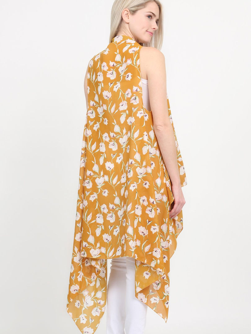 This floral print vest offers a simple way to elevate your everyday outfits. With its draped open front and flowing handkerchief hem, it adds a touch of effortless style, whether you're layering it over a simple top or using it as a chic bikini cover-up during warmer months.