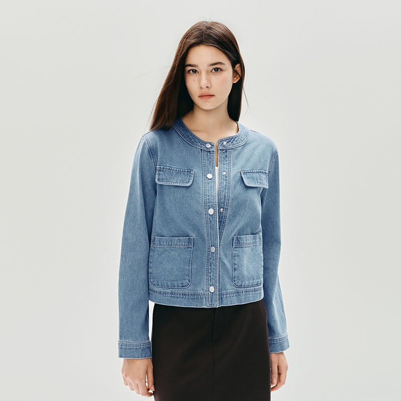 Tags: women's short denim jacket, cropped denim jacket for high waisted jeans, collarless jean jacket for women, crew neck denim jacket autumn style, single breasted short jean jacket, lightweight denim jacket for layering, short denim jacket to wear over dresses, casual o-neck denim outerwear, women's versatile cropped jacket, solid color short jean jacket with pockets, autumn fashion short denim jacket, what jacket to wear with high waist pants, button up short denim jacket women, standard thickness autumn jacket women