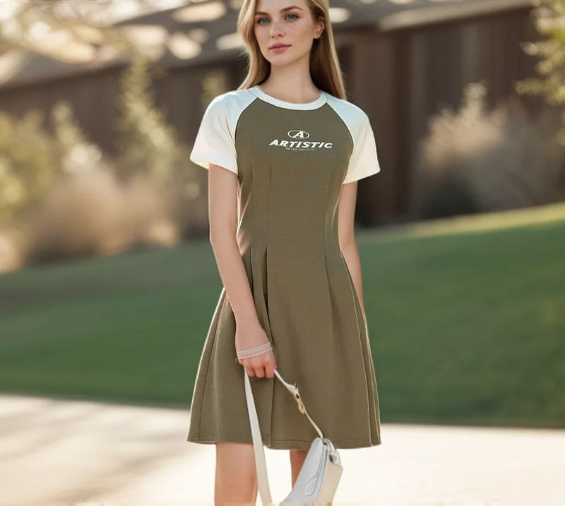 Loose Fit Knee-Length Dress, O-Neck Letter Print, Draped Cotton Blend Attire