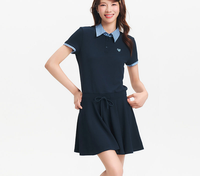 Tags: women's preppy style polo dress, fake two piece plaid dress, polo top with attached plaid skirt, slim fit a-line summer dress, knee length preppy dress for women, casual short sleeve polo dress, embroidered letter plaid dress, collared dress with plaid bottom, one piece layered look dress, women's a-line polo dress, summer dress with slight stretch, waist-defining preppy dress, pullover polo dress knee length, plaid bottom knit top dress