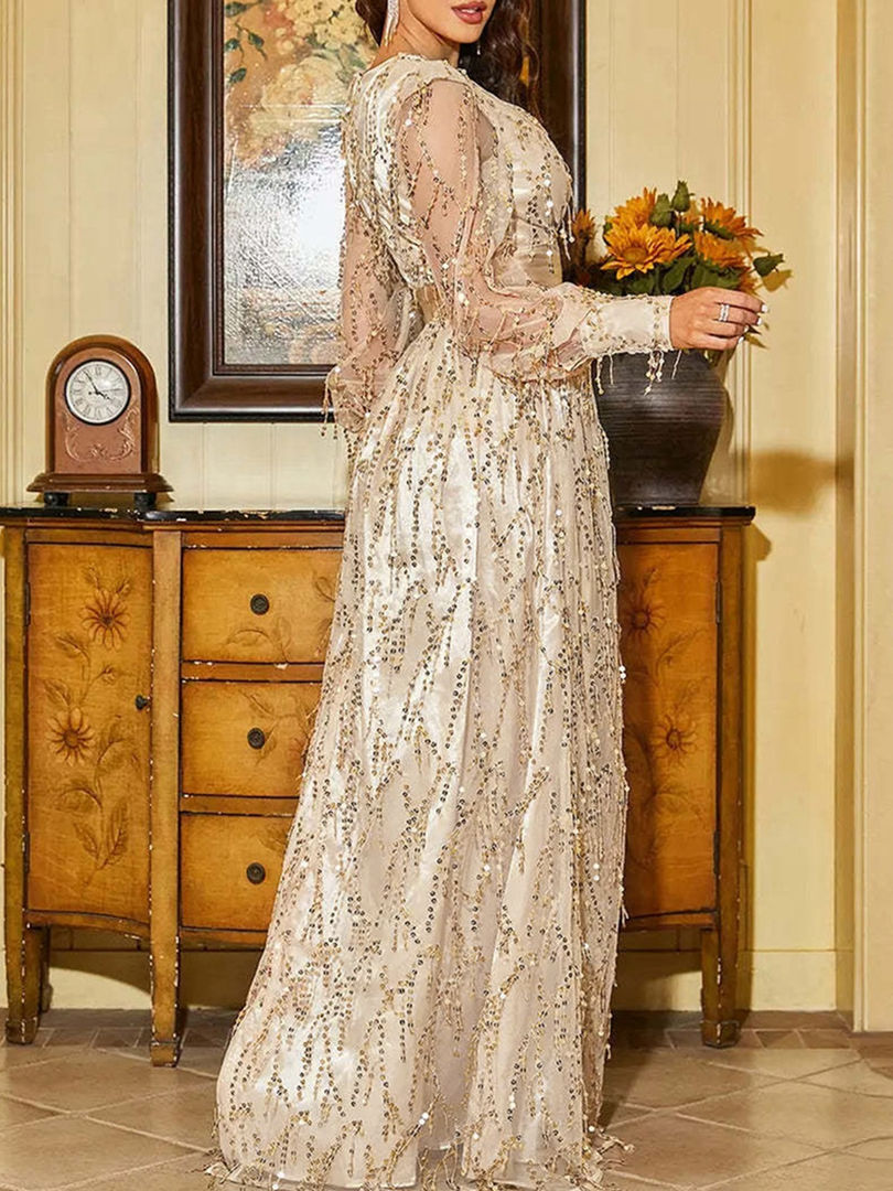 Sequin Deep V-Neck Floor Length Slim Fit and Flare Evening Prom Banquet
