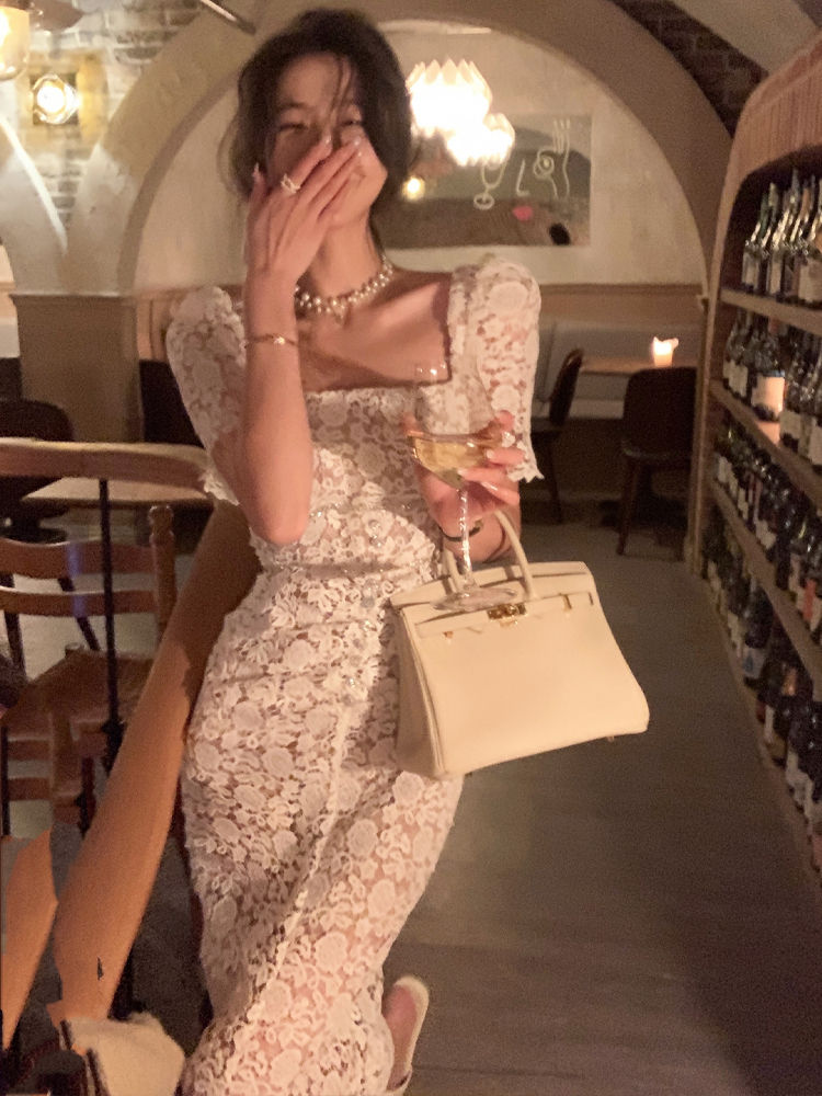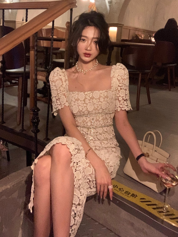 Tags:lace midi dress, bodycon midi dress, elegant summer dress, korean style dress, vintage inspired dress, office lady dress, short sleeve midi dress, A-line midi dress, empire waist dress, summer party dress, semi-formal dress for women, silk blend midi dress, polyester lace dress, slim fit midi dress.