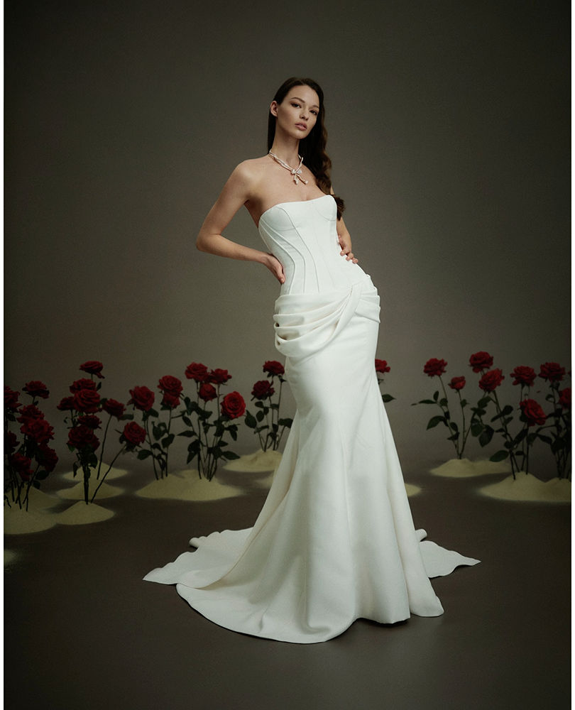 - Delicate silver jewelry to complement the strapless neckline.