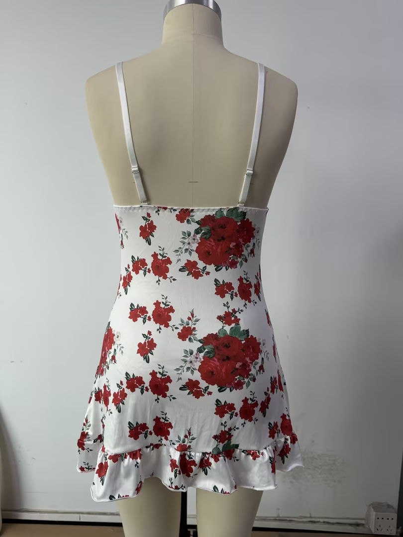 Rose Print Lace Trim V-Neck Sleeveless Cami Mini Dress Nightgown Lingerie Knit