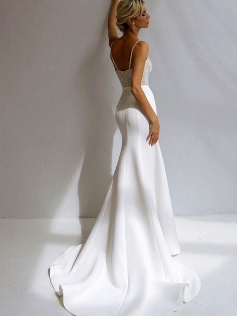 Tags: mermaid wedding dress with pearls, v-neck satin wedding gown, sleeveless boho bridal dress, vintage style wedding dress, beaded wedding dress for pregnant women, floor length mermaid wedding dress, affordable satin wedding dress, custom made wedding dress online, plus size mermaid wedding dress, beach wedding dress with spaghetti straps, elegant v-neck bridal gown, simple satin wedding dress with pearls, sheath wedding dress with train, boho wedding dress with pearl details.