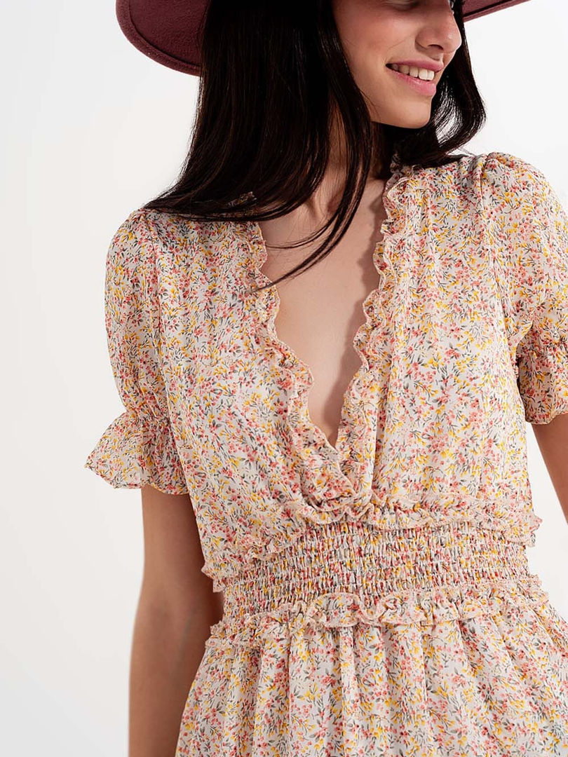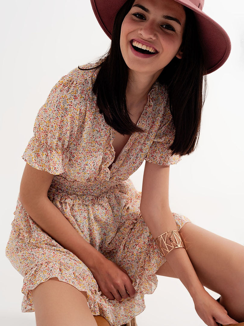 Mini Dress Floral Print Short Sleeve V-Neck Relaxed Fit Casual Skater Dress Yell