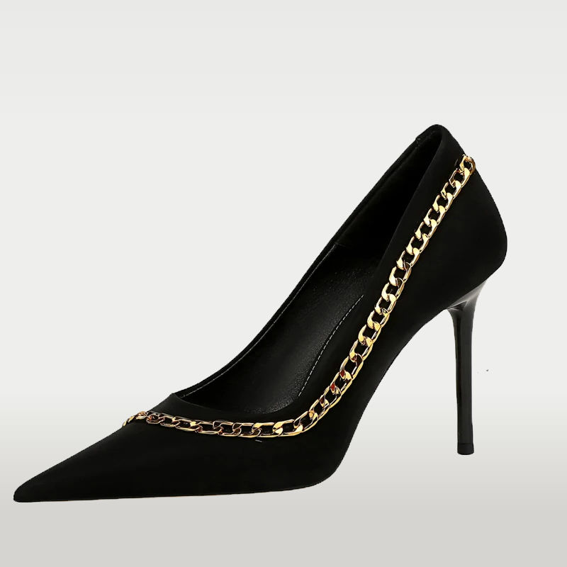 women's silk high heel pumps, pointed toe stiletto heels with chain, evening party shoes for women, slip on high heels luxury, black silk pumps chain detail, statement heels for night out, elegant stiletto pumps silk, fashion high heels for cocktail dress, designer inspired chain pumps, super high heel dress shoes, leg lengthening pumps for women, chic party footwear, modern stiletto heels with embellishment.