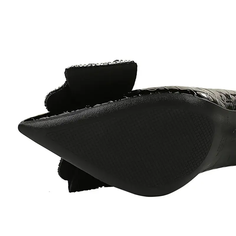 Get ready to elevate your evening style with these super high stiletto pumps. The sleek patent leather upper combined with a sharp pointed toe creates a silhouette that demands attention, while the charming butterfly-knot detail adds just the right amount of playful sophistication. Slip these on, and you're instantly prepared for a memorable night out.