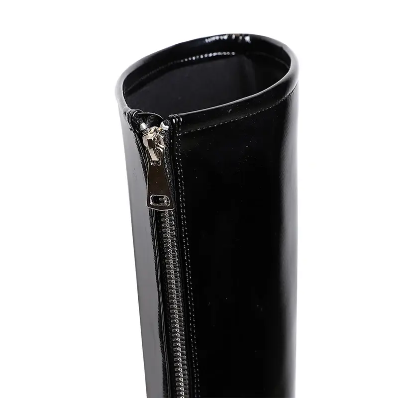 These super high heel knee-high boots are your ticket to a standout winter look. Crafted from sleek patent leather, they feature a modern square toe and a confident, bold heel. The zipper closure ensures they slip on easily and fit securely, ready to elevate your style.