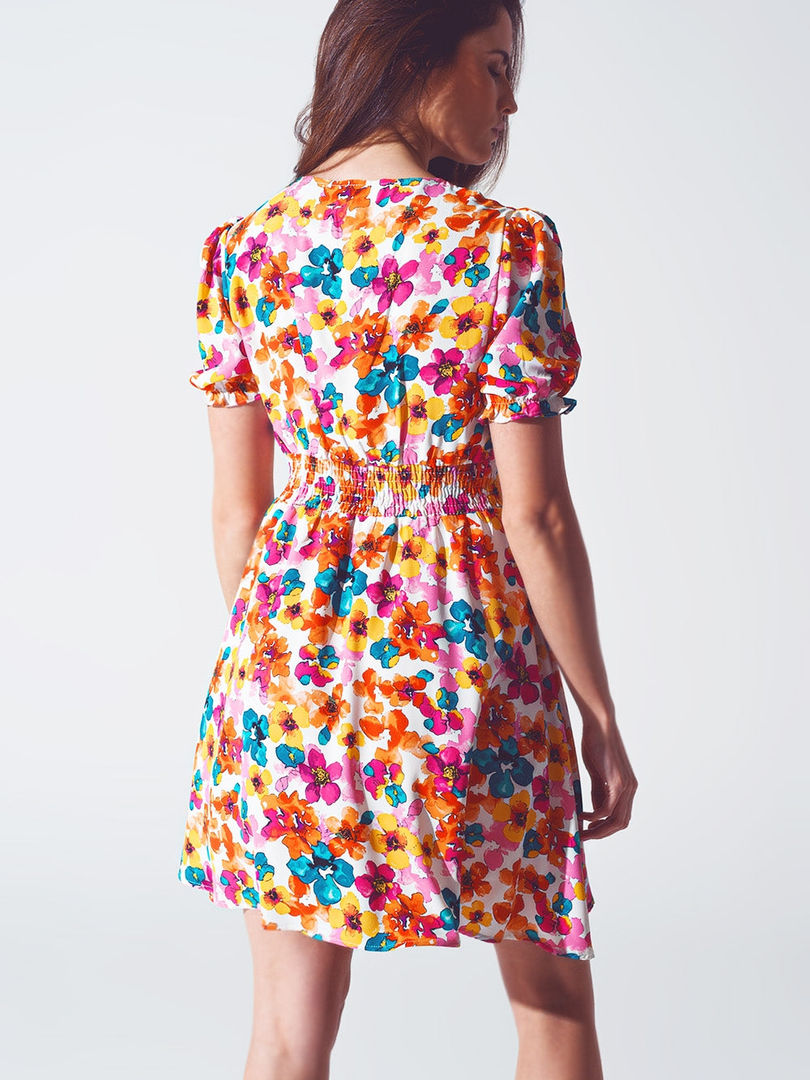 Mini Dress Multicolor Floral Print V-Neck Puff Sleeve Lightweight Woven Fabric