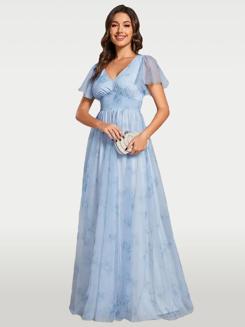 Look timeless and elegant in this classic A-line evening dress. The luxurious chiffon fabric drapes beautifully, while the V-neckline adds a touch of sophistication. Short sleeves offer a touch of coverage, and delicate lace appliques with a playful bow detail add a touch of whimsy. This dress flatters all ages and is perfect for formal evenings.