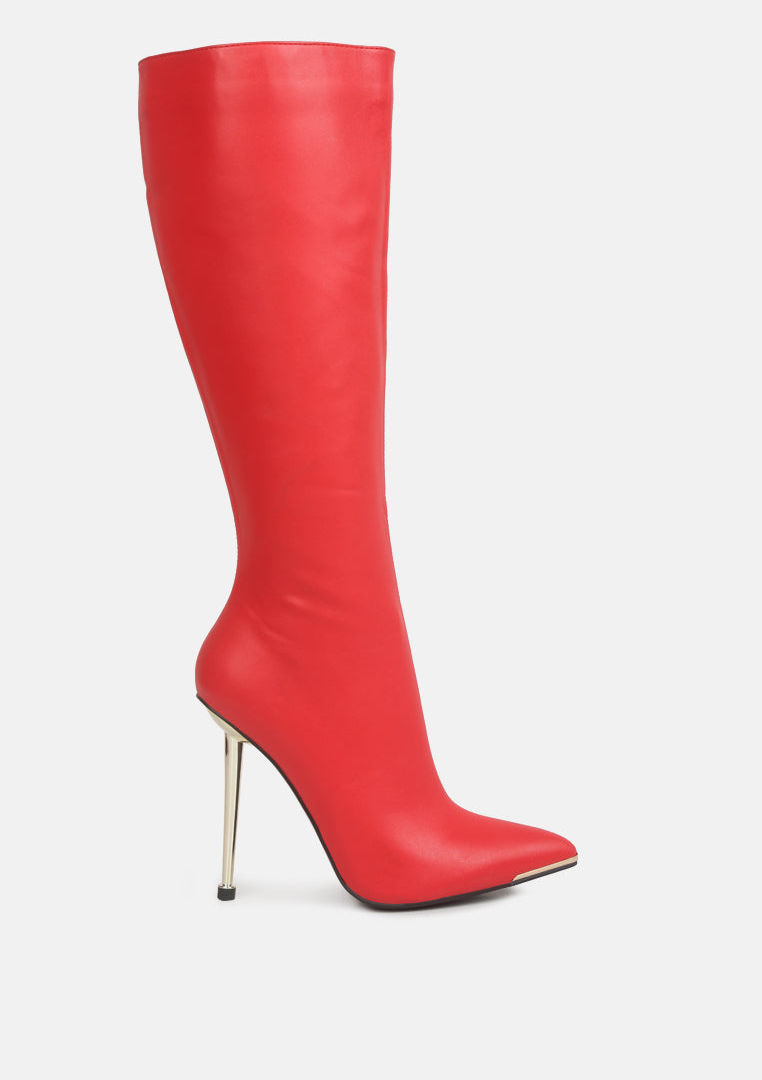 knee-high stiletto boots, pointed toe winter boots, faux leather tall boots, side zip fashion boots, women's elegant heeled boots, metal detail boots, stylish winter footwear, day to night boots women, chic cold weather boots, versatile tall boots, comfortable heeled boots, modern knee-length boots, easy wear winter boots, sophisticated women's boots.