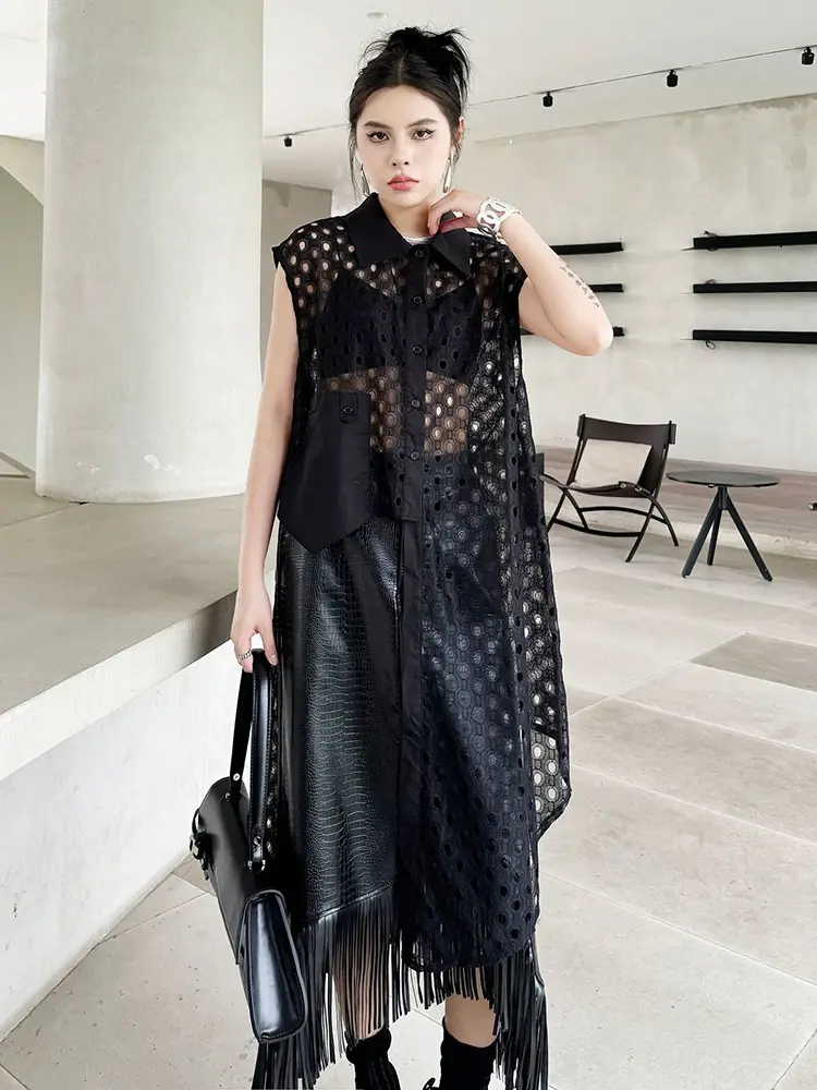 Beat the heat in style with this black and white sleeveless button-down. Made from a comfortable, midweight cotton-polyester jersey blend fabric (avoid using "synthetic fiber"), it offers a flattering loose fit for most body types.